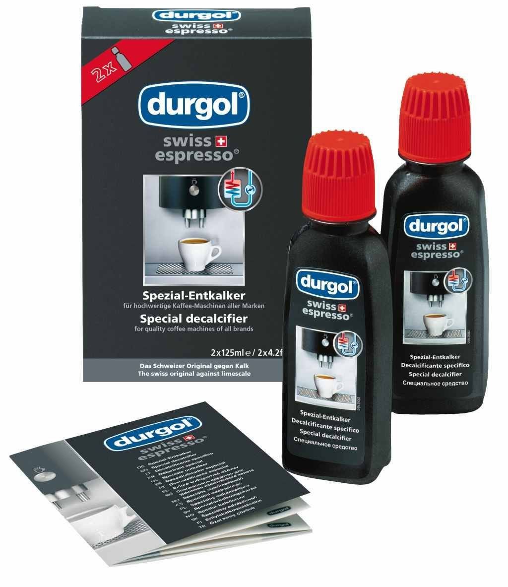 Рідина для чищення від накипу Durgol Swiss Espresso Обсяг 1-го флакона - 125 мл. В упаковці 2 флакона. Вміст флакона повністю розчиняти в 1,5 л води. 1 флакон розрахований на 1 чистку.